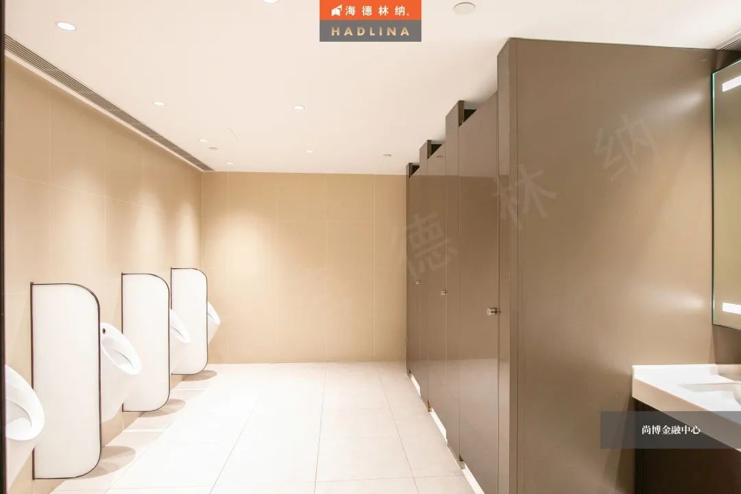 尚博金融中心采用海德林納?天地式衛生間隔斷系統,封閉式空間保護隱私。在設計上,隔斷正面鑲嵌玻璃作點綴,使衛生空間整體通透,在視覺上有很強的延伸感,給人低調奢華的感受。