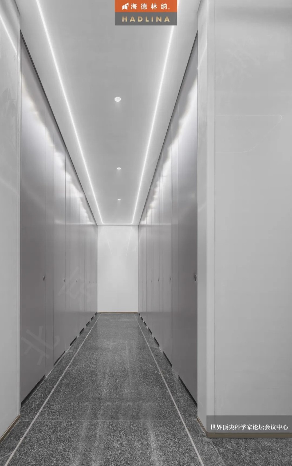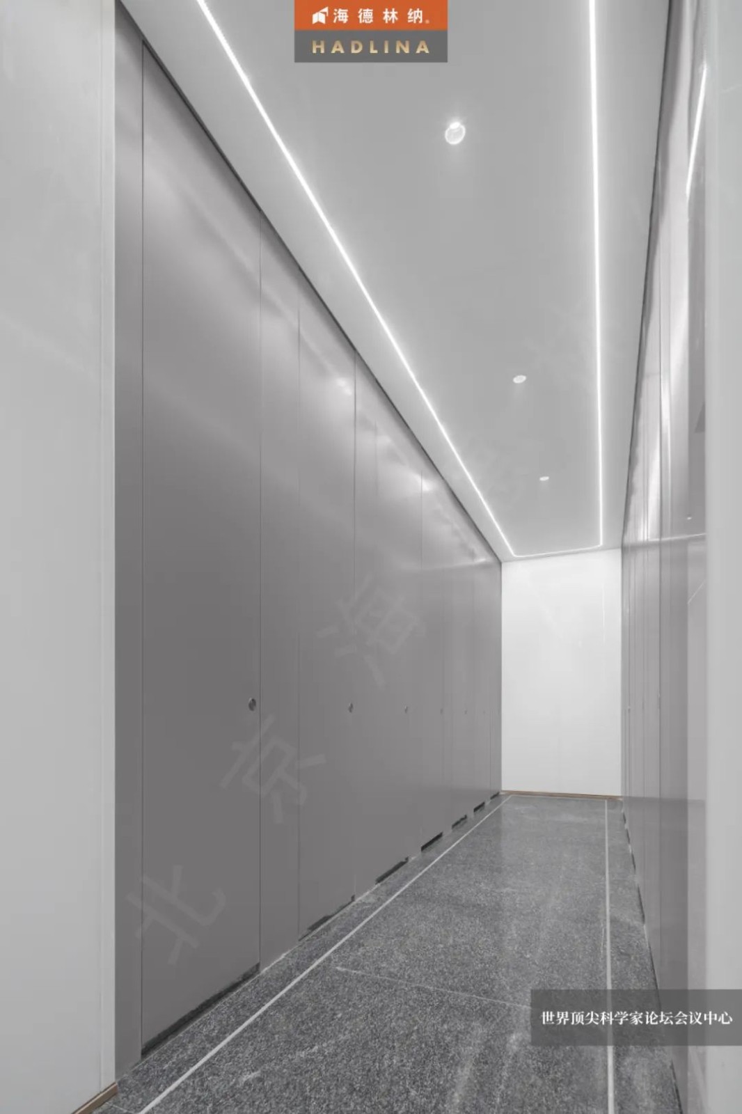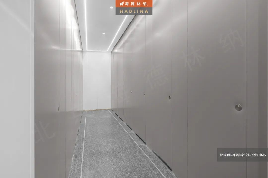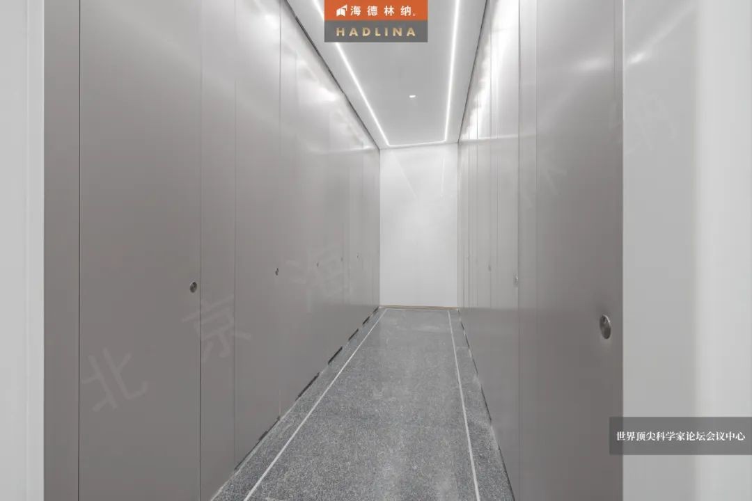 世界頂尖科學家論壇會議中心公共衛生空間項目由海德林納?承建。海德林納?設計團隊通過對項目定位、項目設計理念進行分析,選擇使用海德林納?天地式金屬隔斷,整體設計采用平開合頁,以銀灰配色,搭配雙企口邊型。整體設計風格簡潔不失大氣,現代感十足。