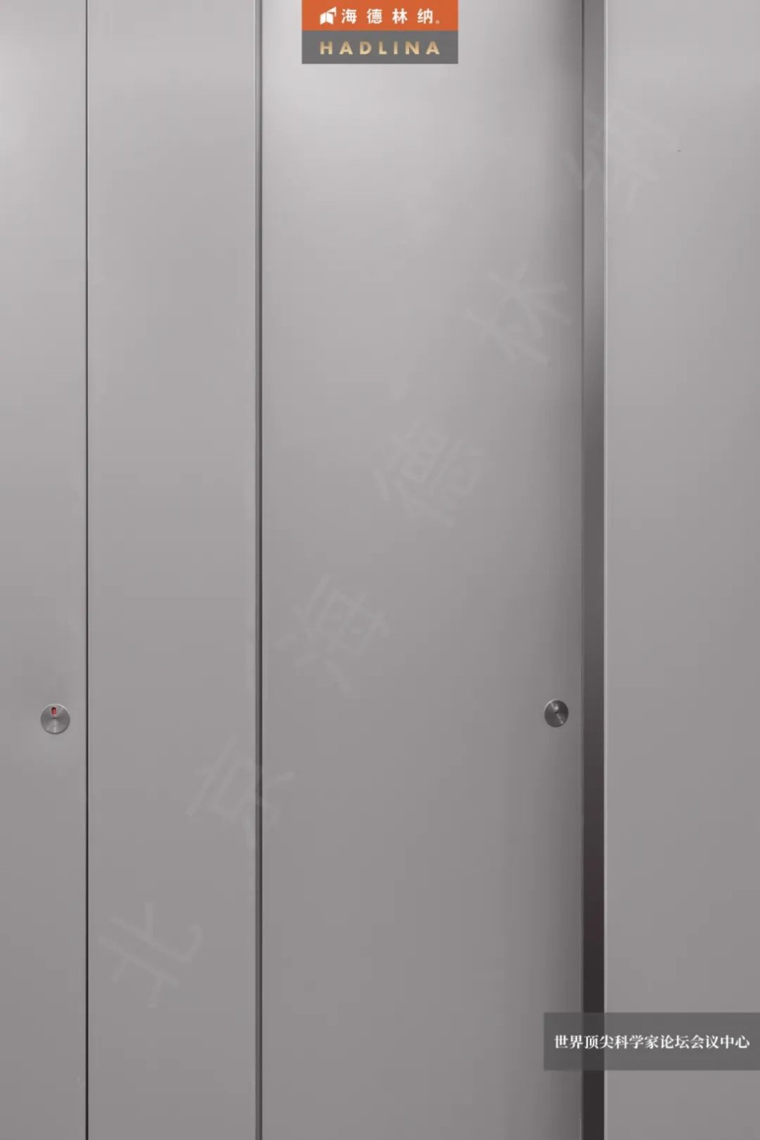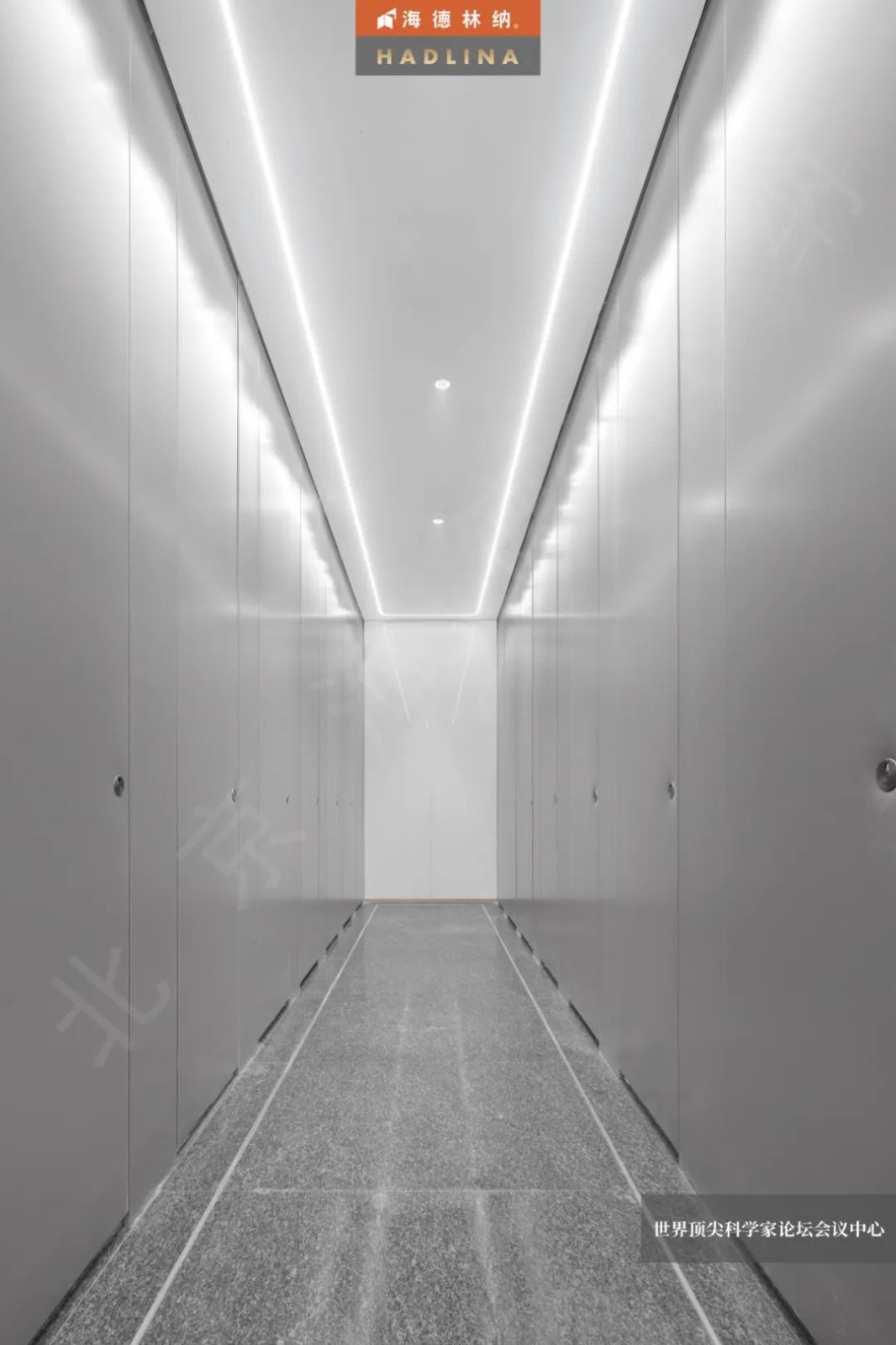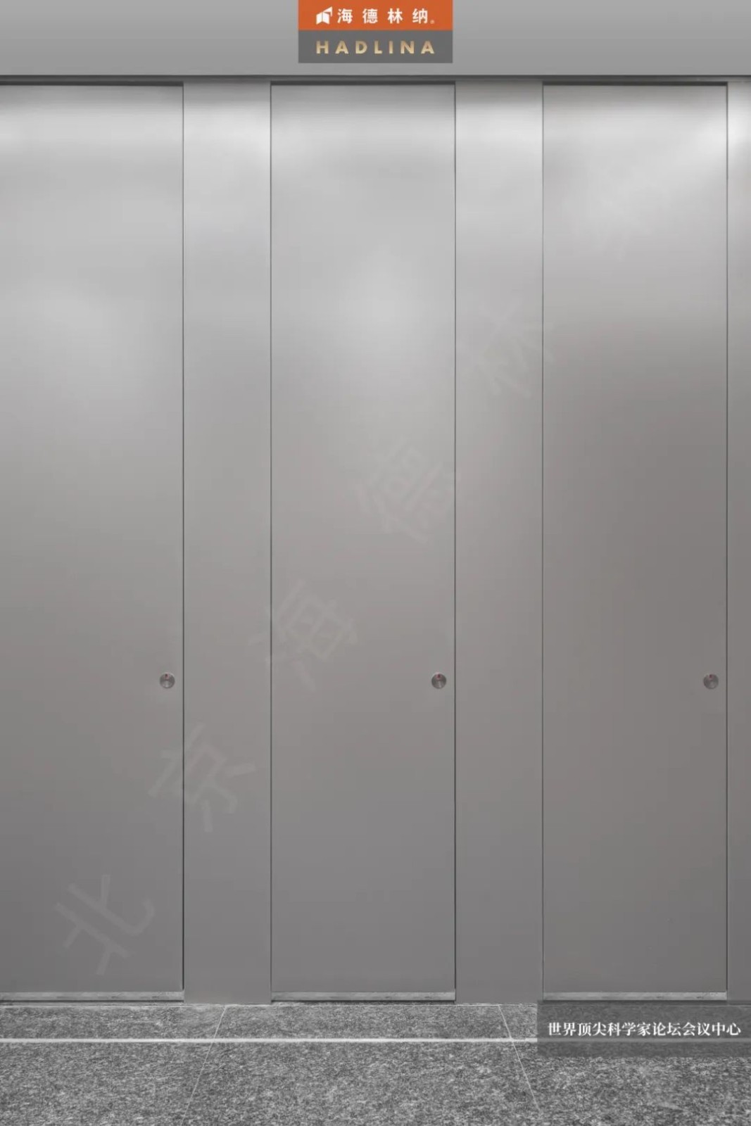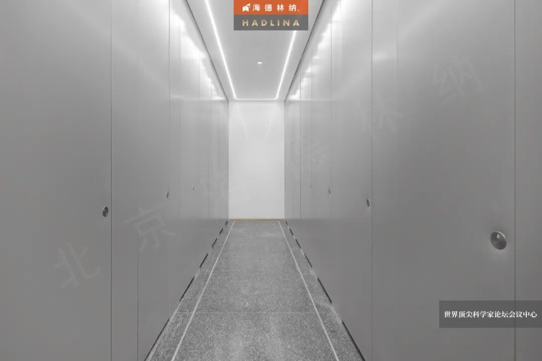 世界頂尖科學家論壇會議中心公共衛生空間項目由海德林納?承建。海德林納?設計團隊通過對項目定位、項目設計理念進行分析,選擇使用海德林納?天地式金屬隔斷,整體設計采用平開合頁,以銀灰配色,搭配雙企口邊型。整體設計風格簡潔不失大氣,現代感十足。