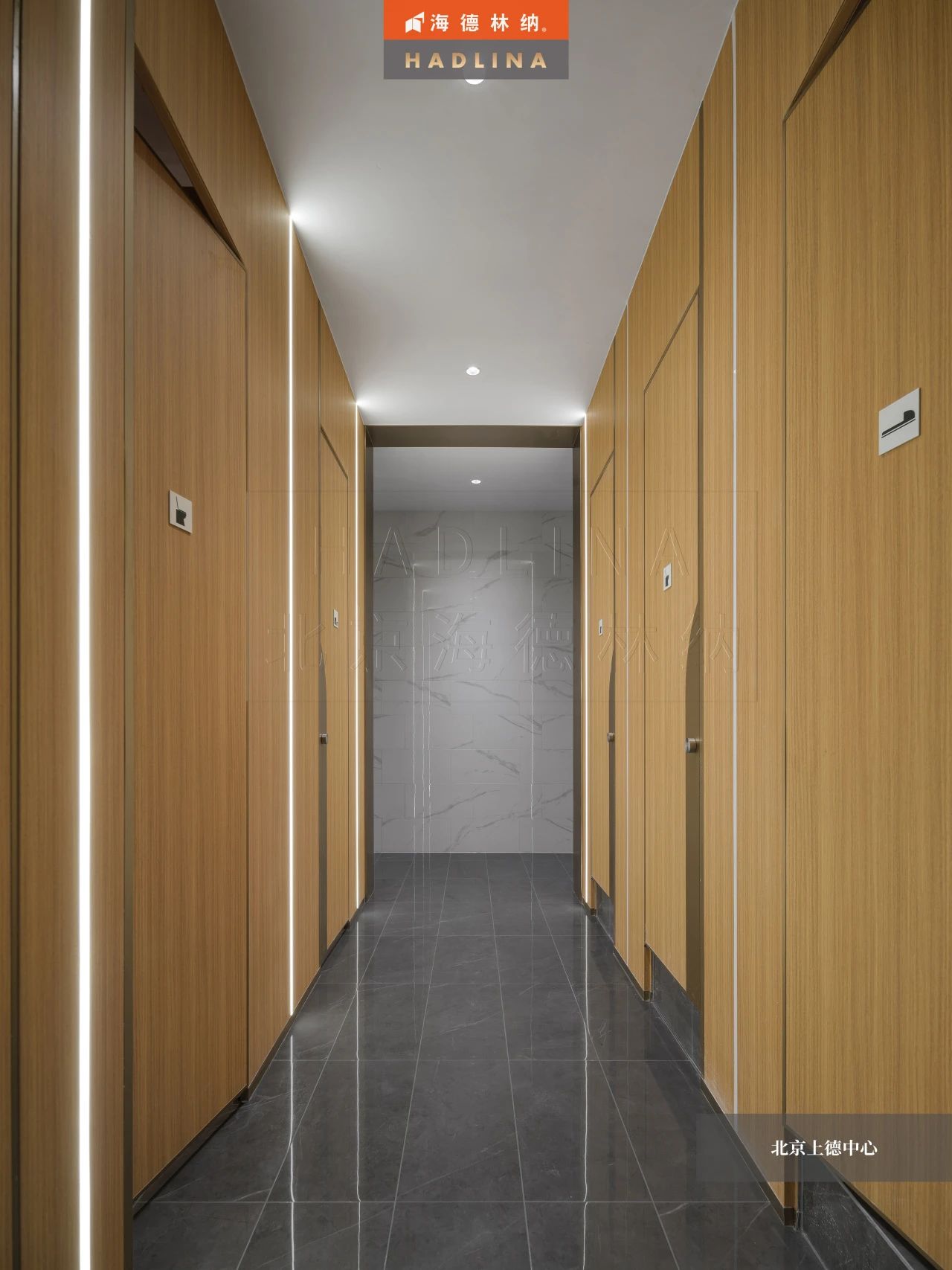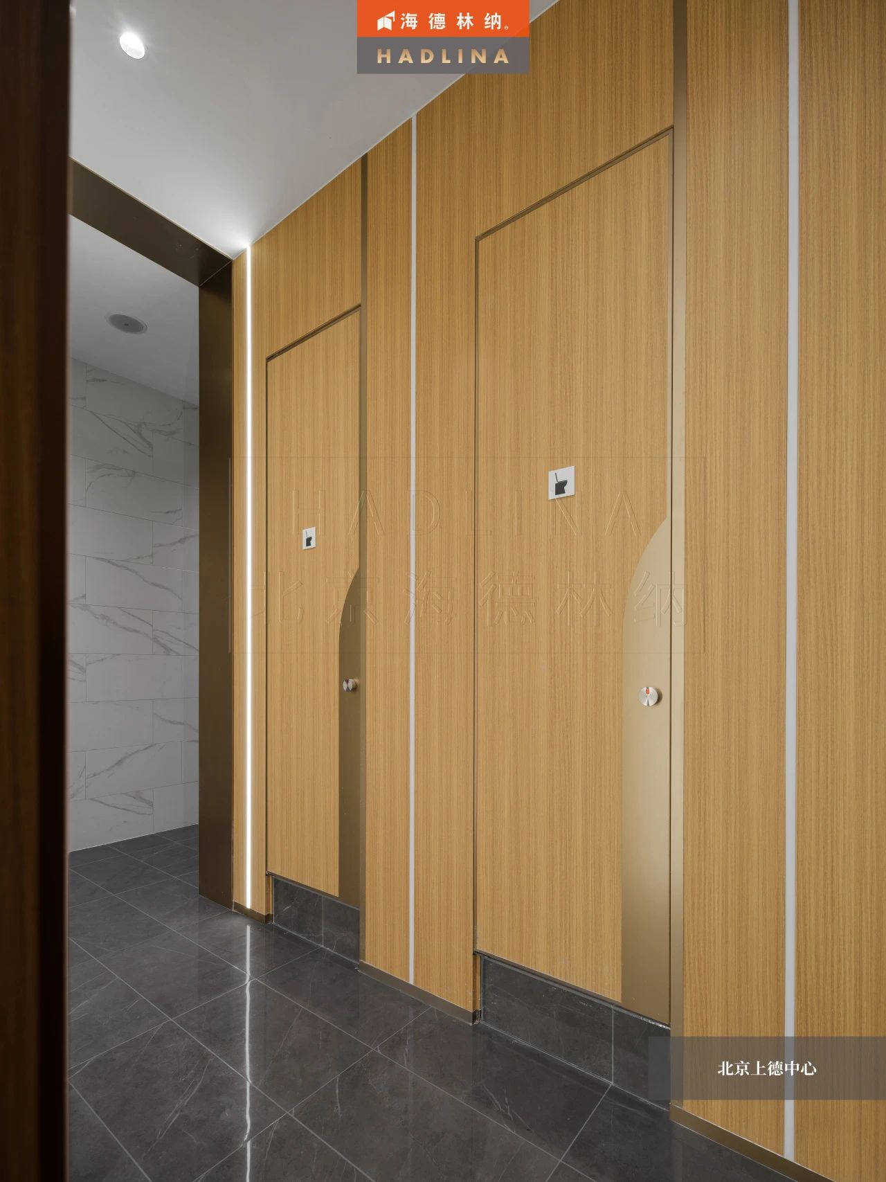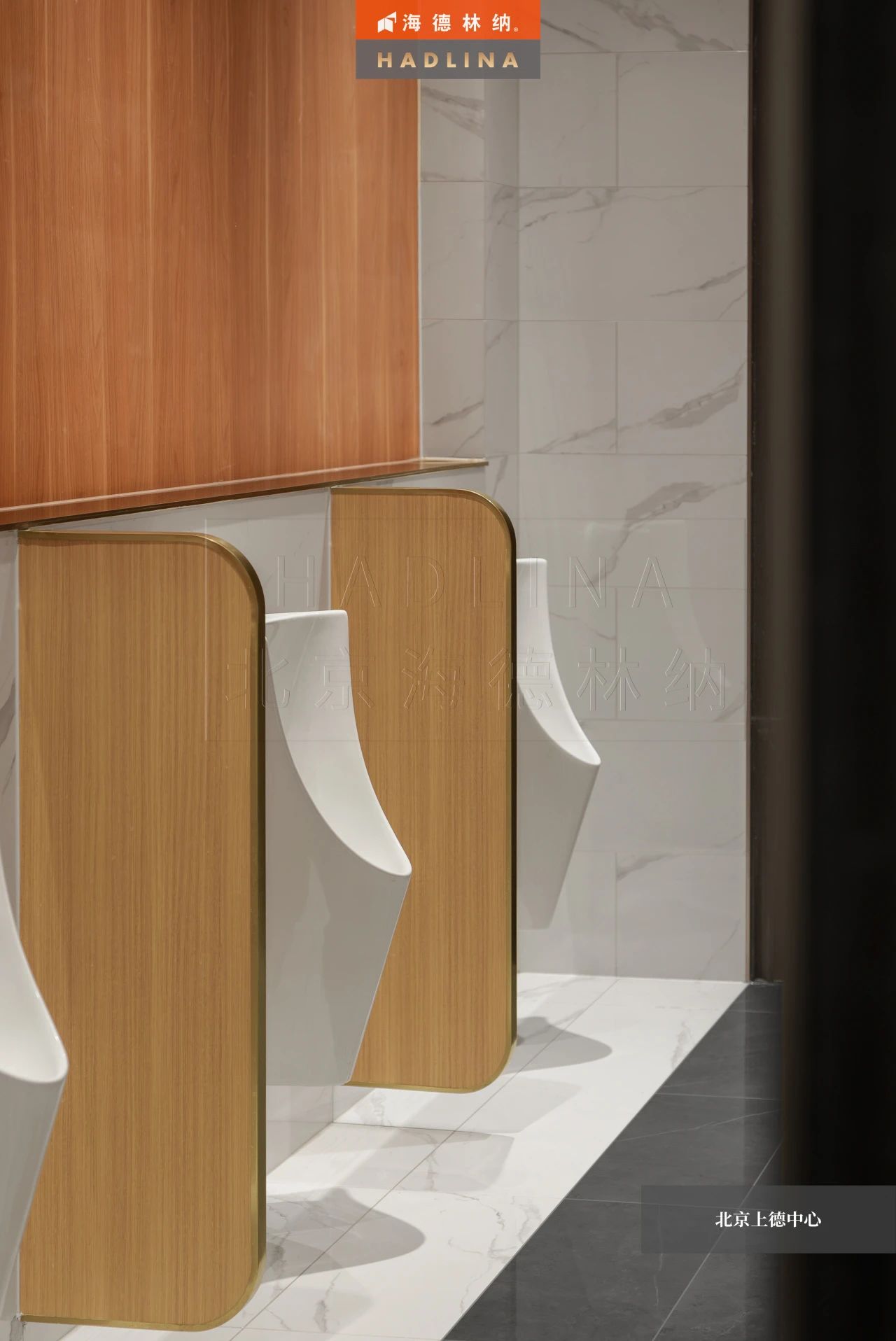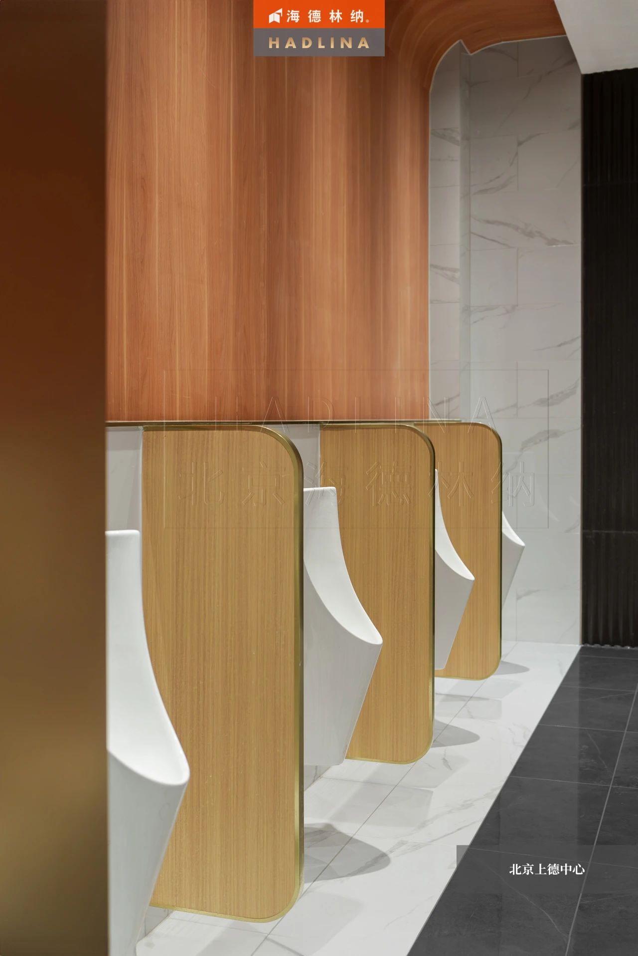 顏色是我們對環境產生直接感受的元素之一。在北京上德中心的公共衛生隔斷中,選擇了海德林納?HD-109款式,顏色為沙漠之橡作為主要顏色,為整個空間注入了溫暖和舒適的氛圍。此款隔斷紋理自然,質感真實,搭配上黑色地板,將現代的元素融入其中,給整個公共空間帶來了一種獨特的時尚感。