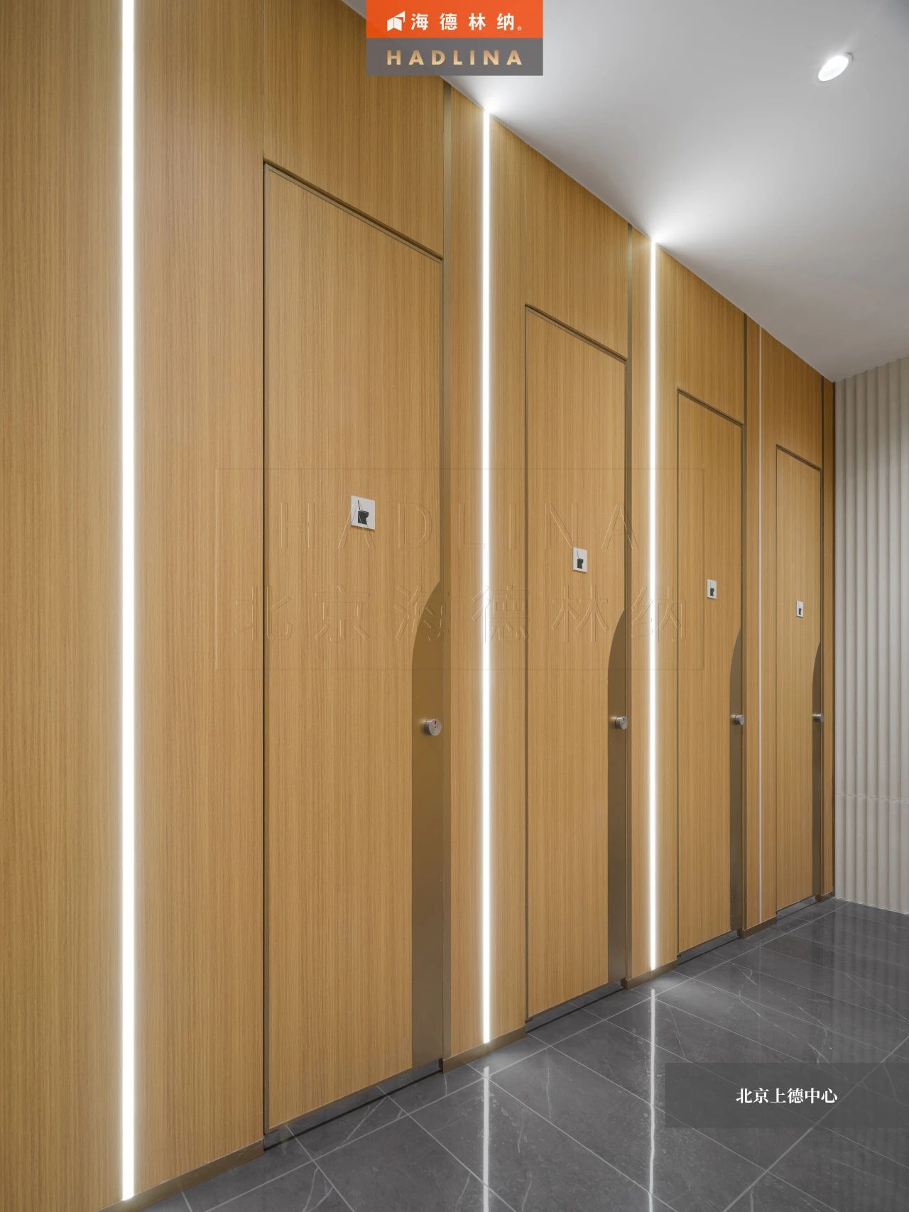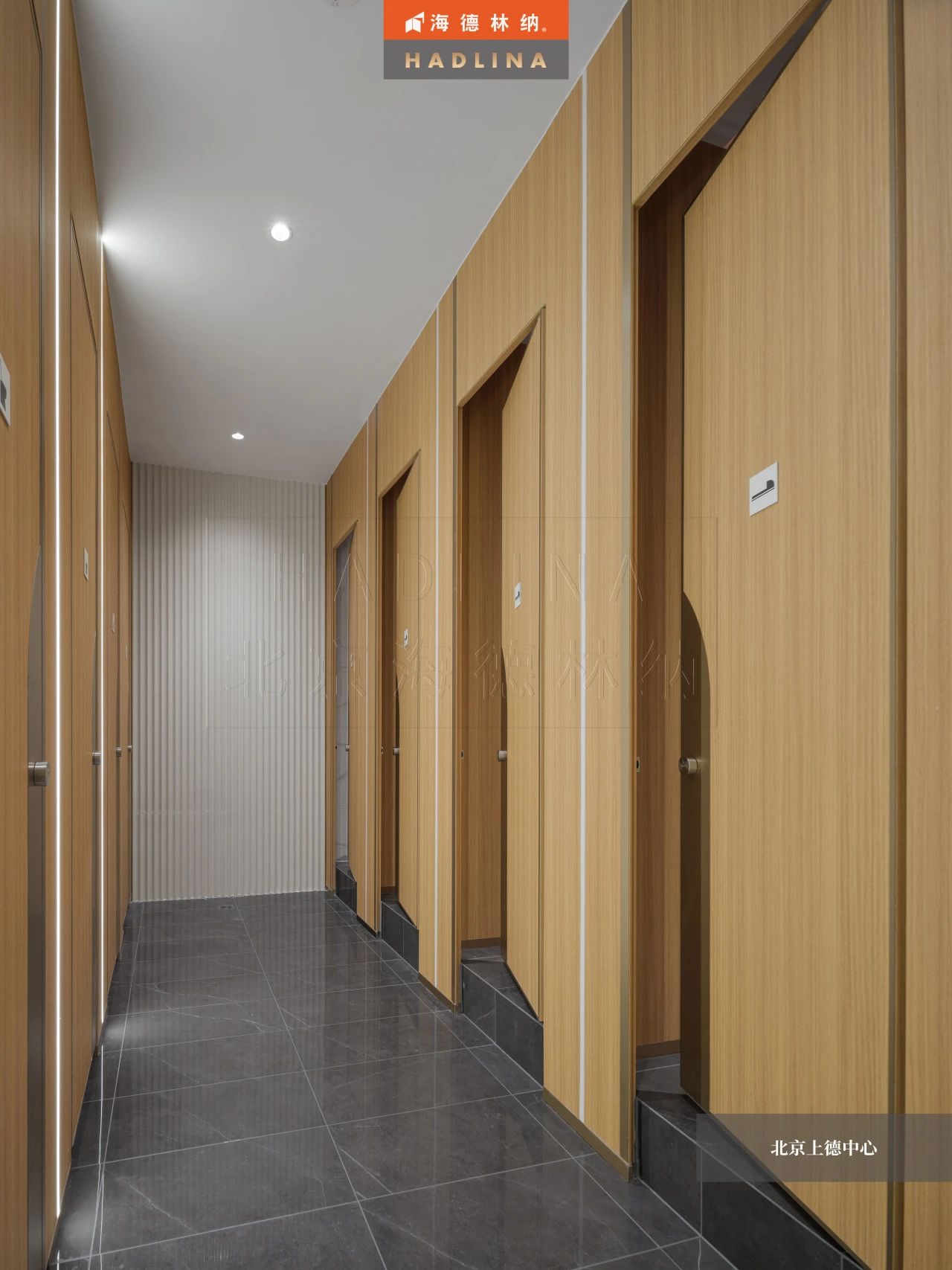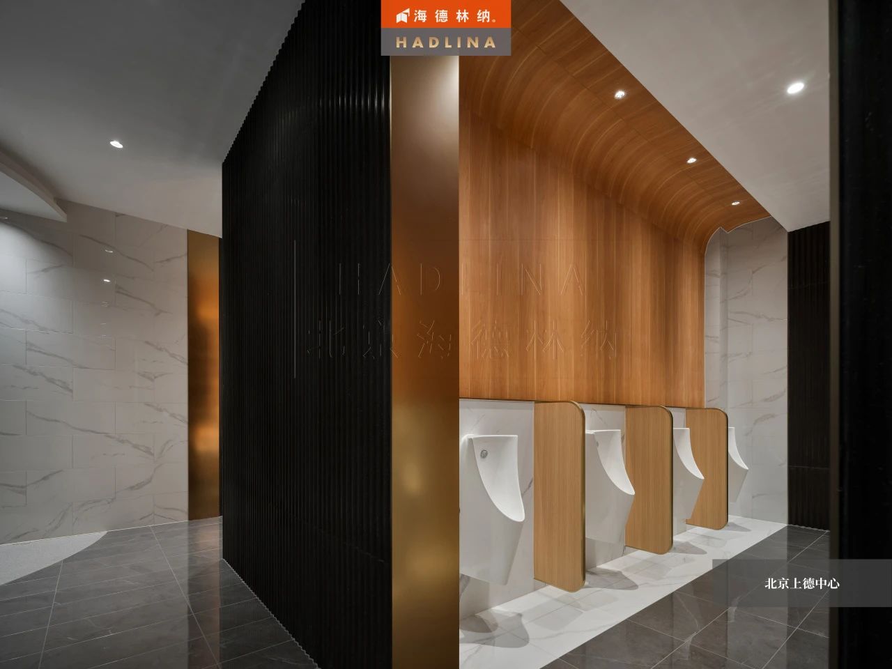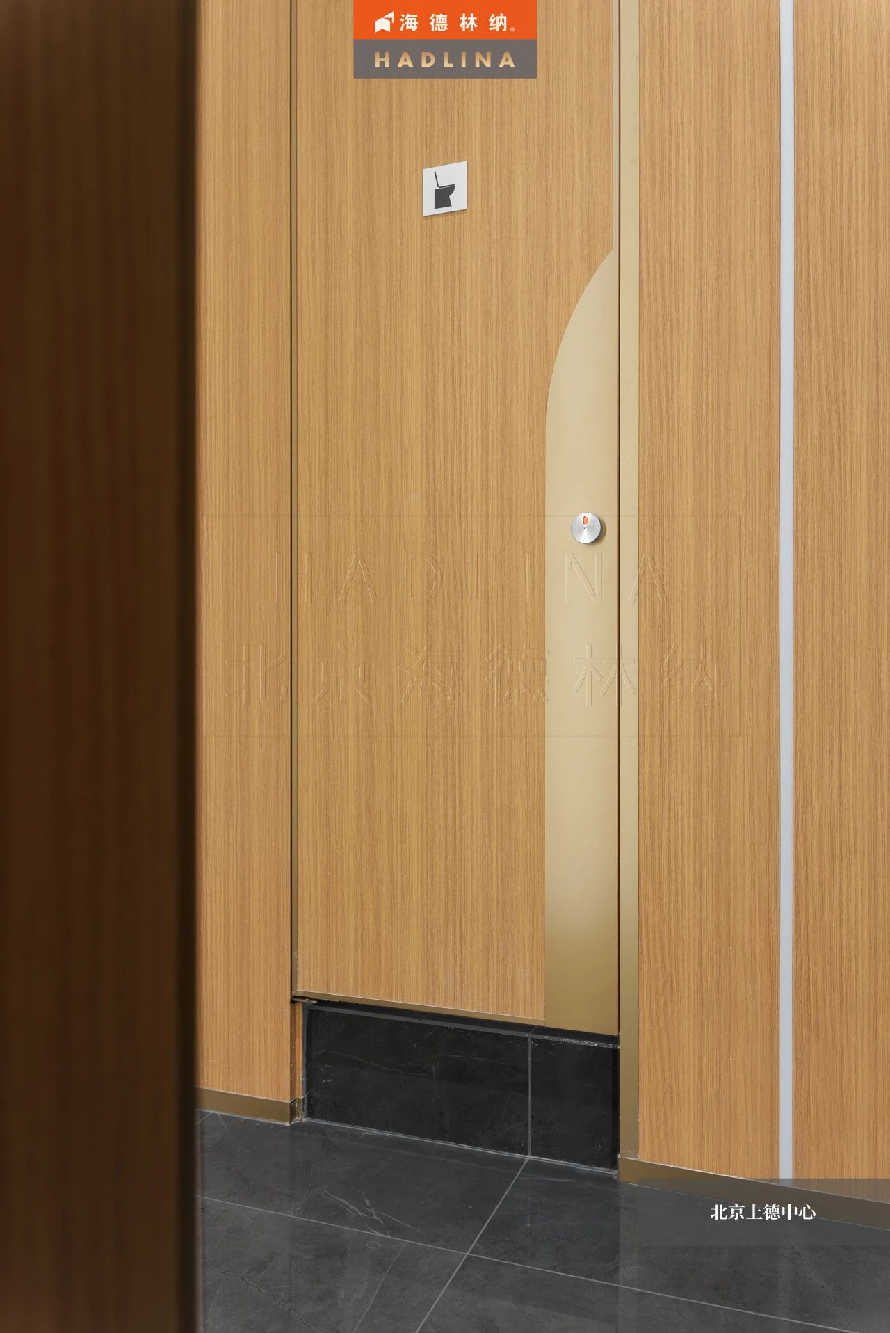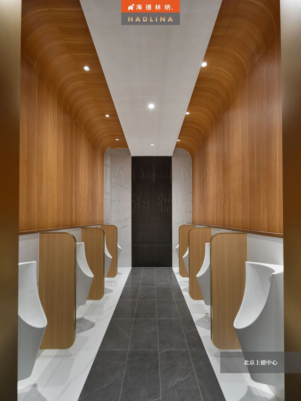 顏色是我們對環境產生直接感受的元素之一。在北京上德中心的公共衛生隔斷中,選擇了海德林納?HD-109款式,顏色為沙漠之橡作為主要顏色,為整個空間注入了溫暖和舒適的氛圍。此款隔斷紋理自然,質感真實,搭配上黑色地板,將現代的元素融入其中,給整個公共空間帶來了一種獨特的時尚感。