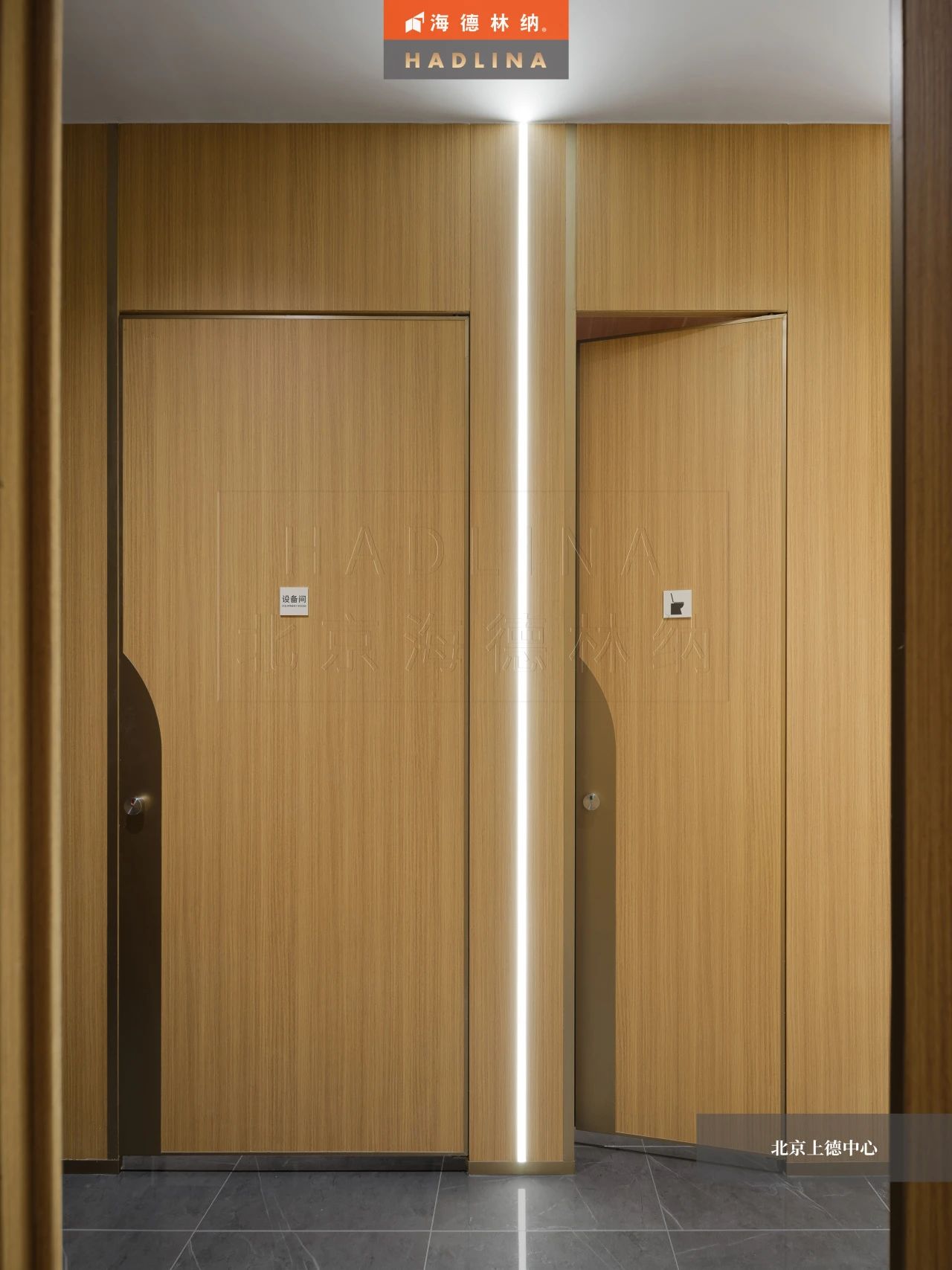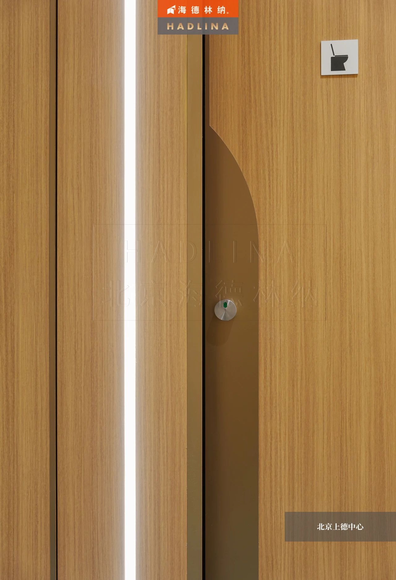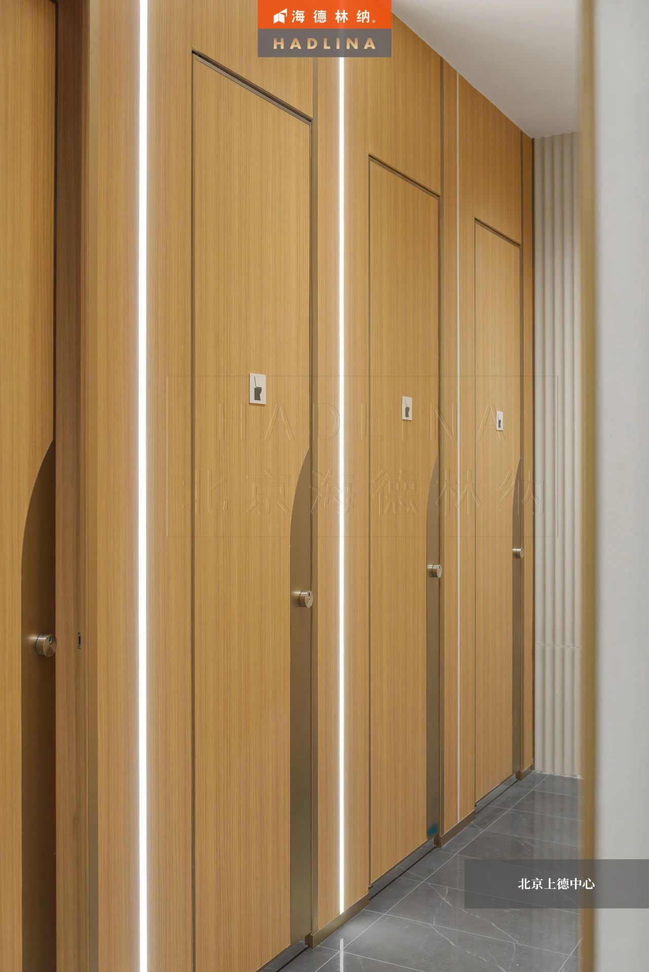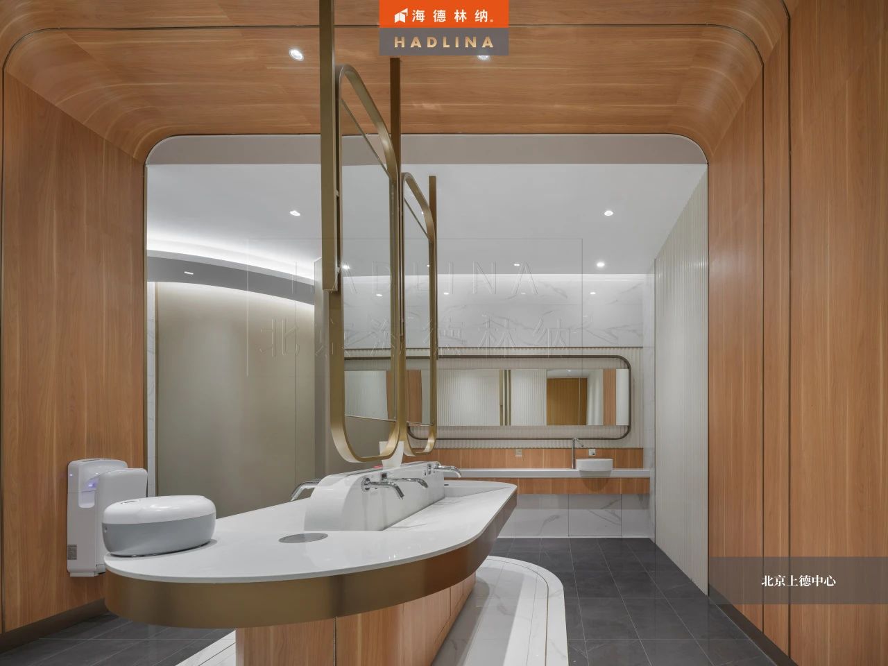 顏色是我們對環境產生直接感受的元素之一。在北京上德中心的公共衛生隔斷中,選擇了海德林納?HD-109款式,顏色為沙漠之橡作為主要顏色,為整個空間注入了溫暖和舒適的氛圍。此款隔斷紋理自然,質感真實,搭配上黑色地板,將現代的元素融入其中,給整個公共空間帶來了一種獨特的時尚感。