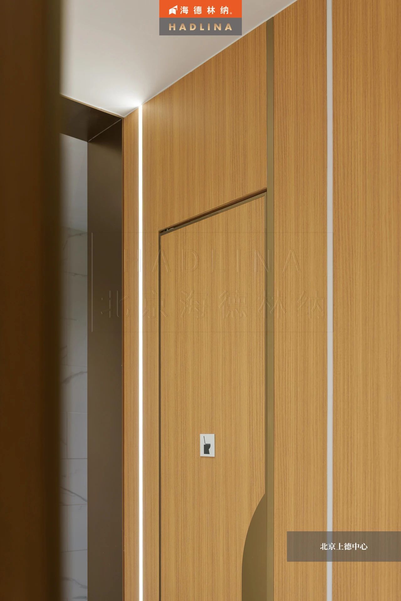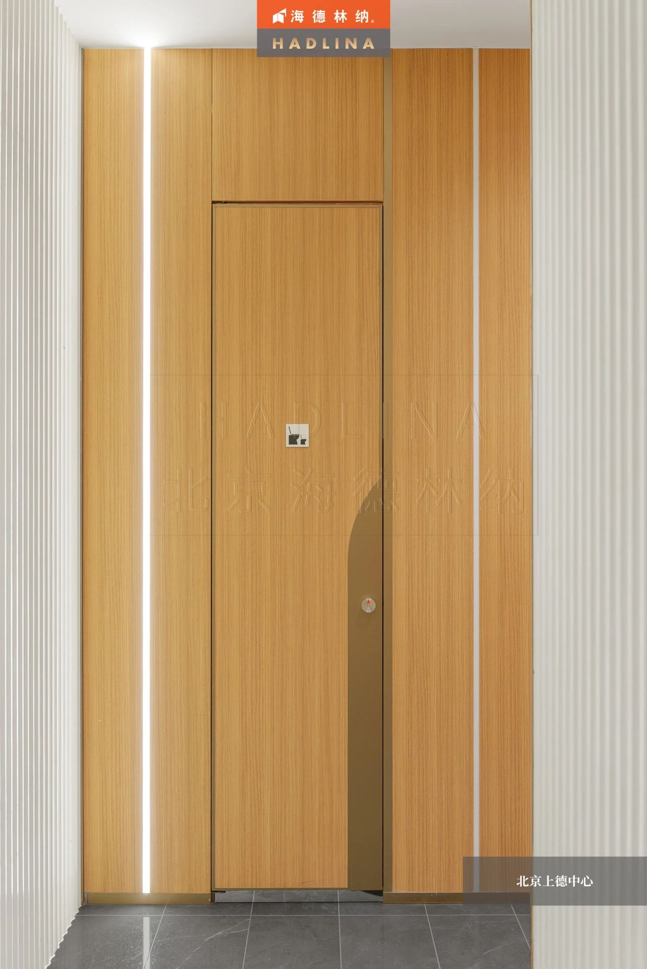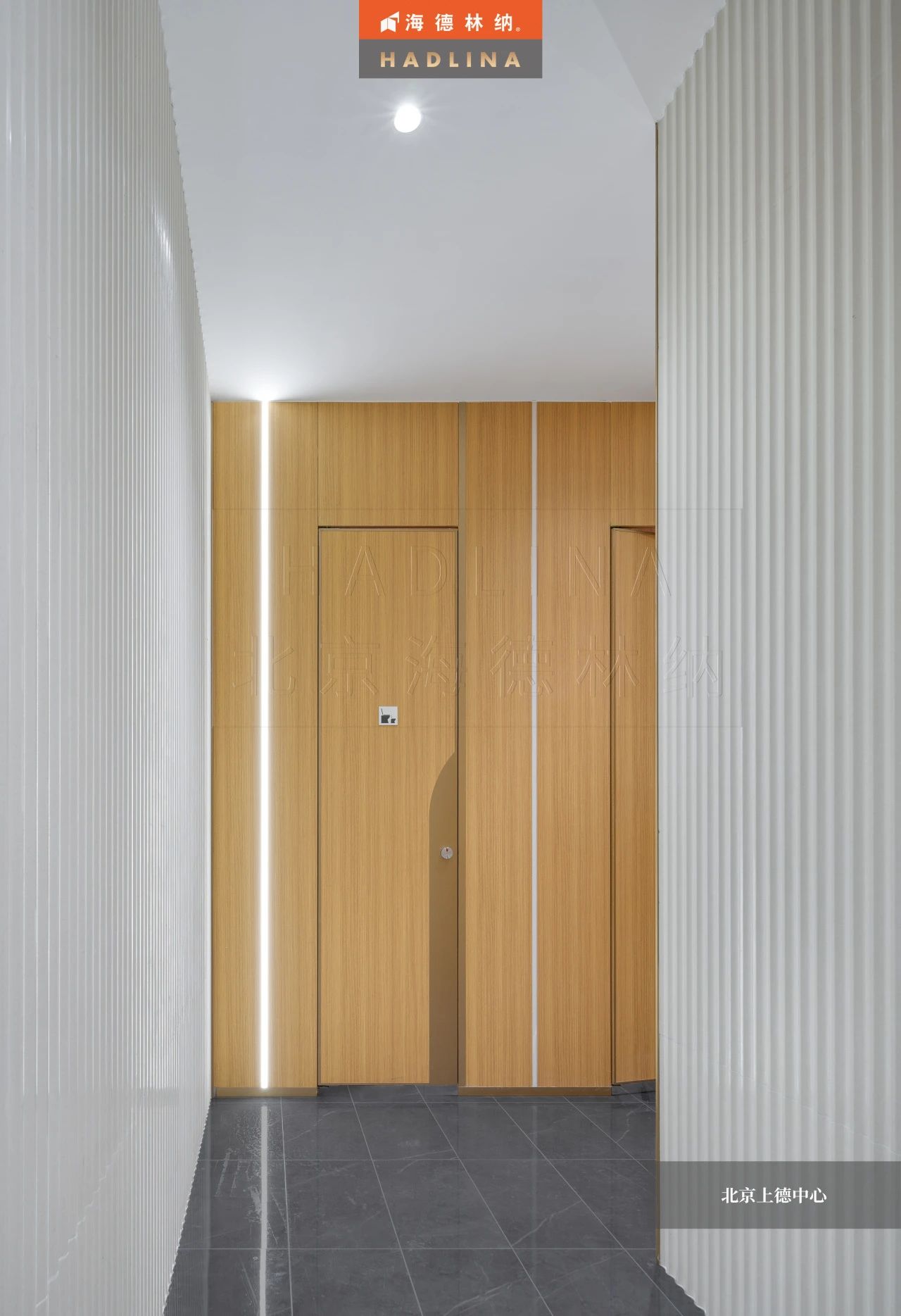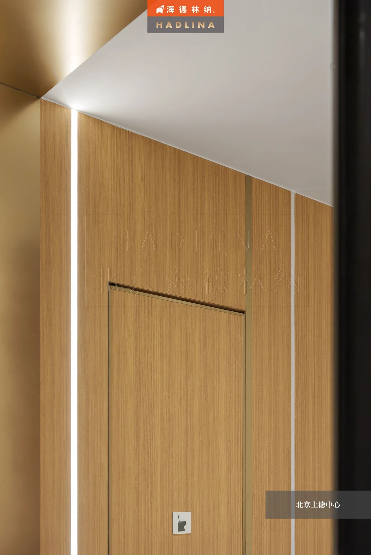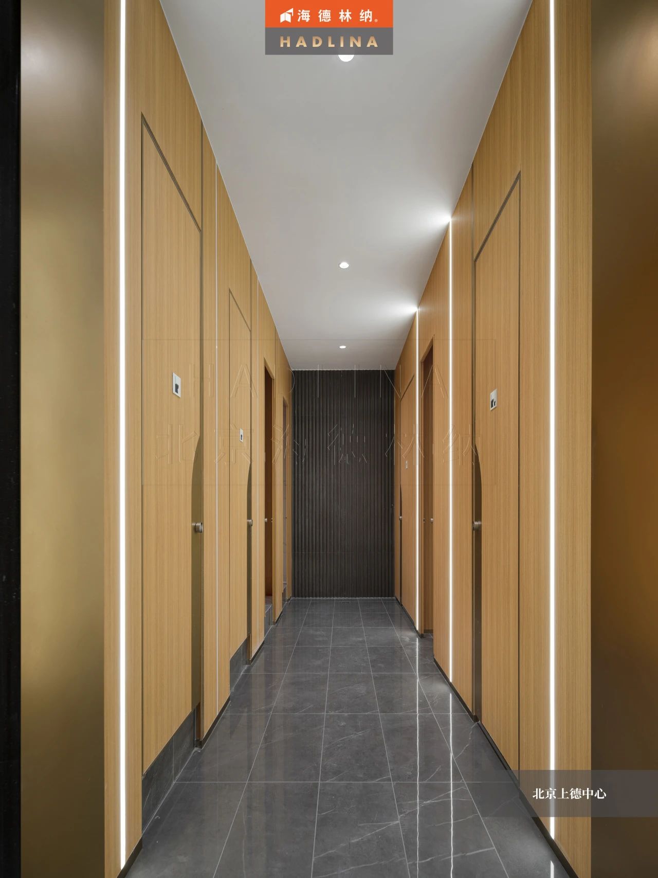 顏色是我們對環境產生直接感受的元素之一。在北京上德中心的公共衛生隔斷中,選擇了海德林納?HD-109款式,顏色為沙漠之橡作為主要顏色,為整個空間注入了溫暖和舒適的氛圍。此款隔斷紋理自然,質感真實,搭配上黑色地板,將現代的元素融入其中,給整個公共空間帶來了一種獨特的時尚感。