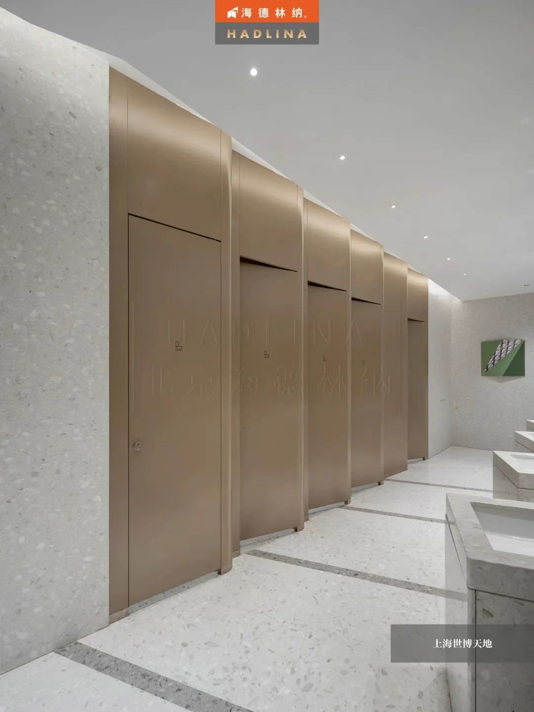 上海世博天地海德林納?衛生間隔斷以卓越品質為核心,采用 32mm 加厚板材精心打造。厚實的板材賦予隔斷強大的承重與抗沖擊能力,穩固耐用,使用壽命長久。同時,板材綠色環保達到A 級防火標準,從根源上保障使用安全,為公共空間筑起可靠的安全防線。表面香檳色金屬材質,不僅彰顯奢華大氣的格調,更具備優異的防腐蝕、抗磨損性能,輕松抵御日常使用中的刮擦與污漬,歷久如新,為空間增添恒久魅力。